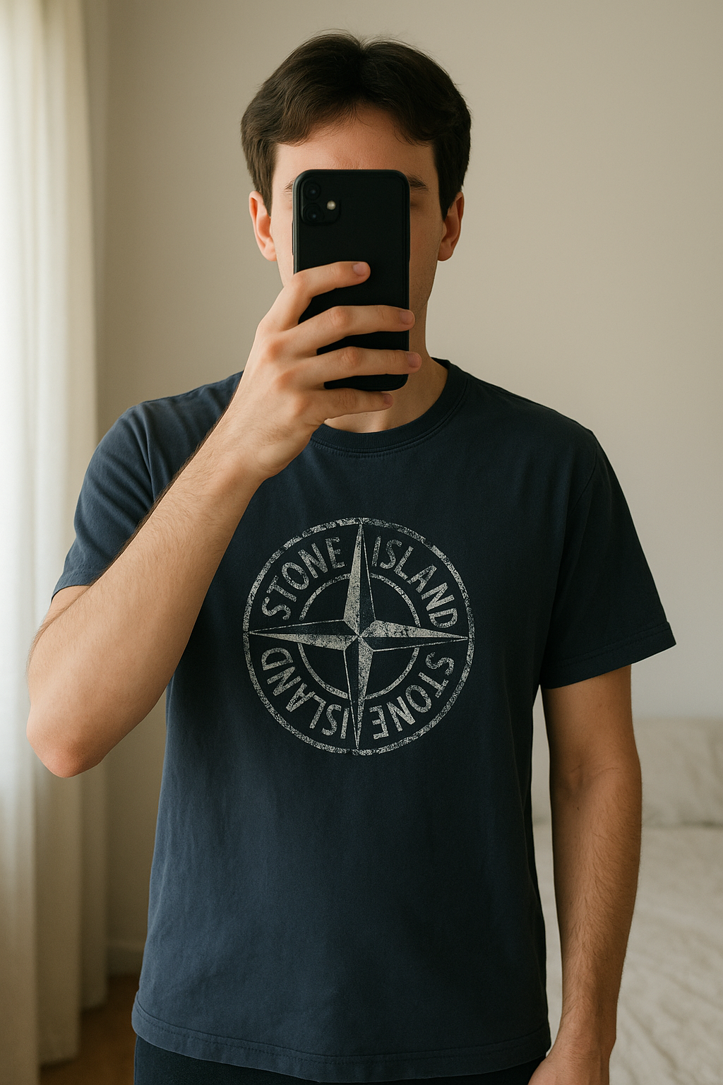T-shirt Stone Island Compass S debout, face à la caméra, dans une chambre à la lumière douce, avec une lumière naturelle filtrant par la fenêtre.