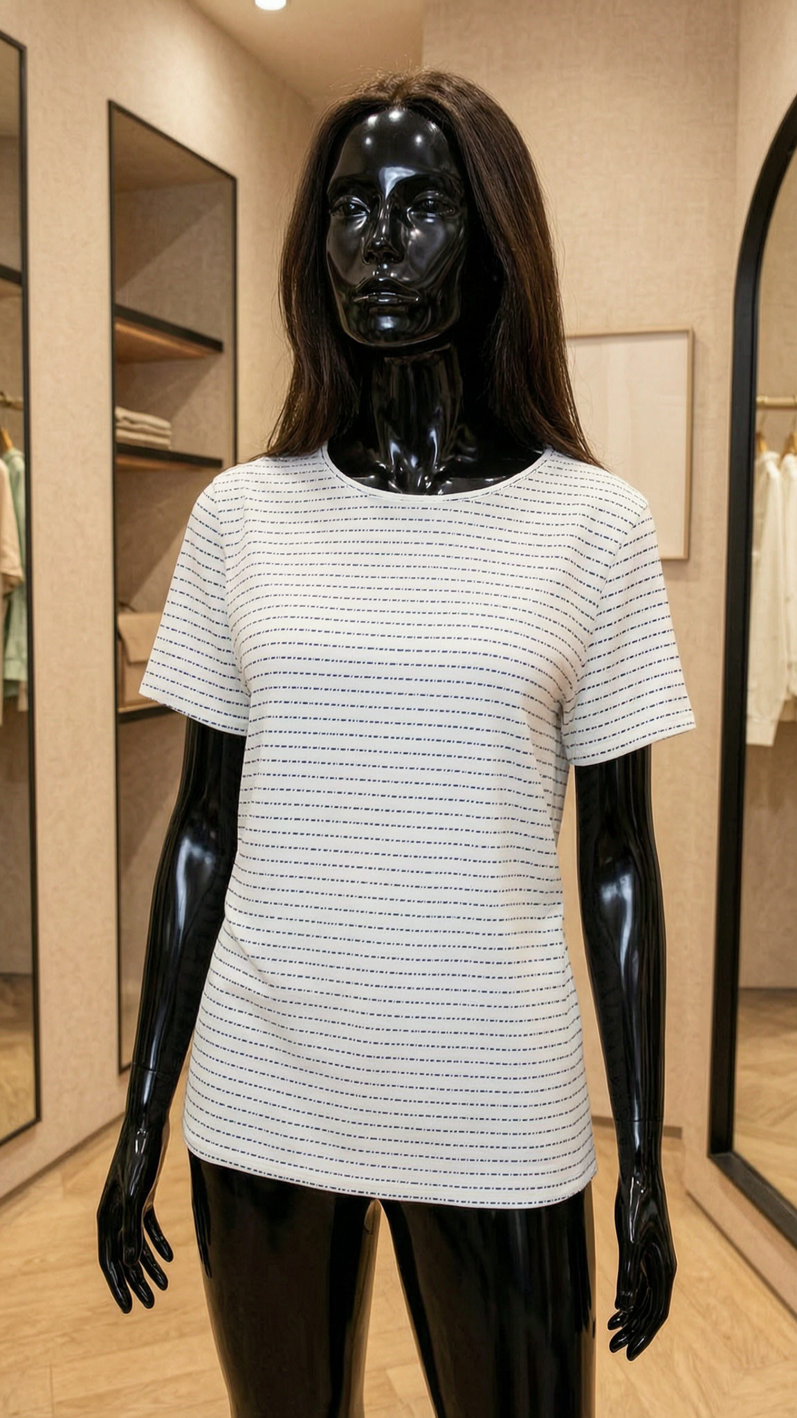 un mannequin noir brillant en plastique, sans traits du visage en T-shirt style marin à rayures, taille 36/38, Marque Intimissimi cambrant légèrement le dos pour une pose dynamique, avec une silhouette légèrement plus ronde, dans une cabine d’essayage de style boutique avec un miroir et une décoration neutre.