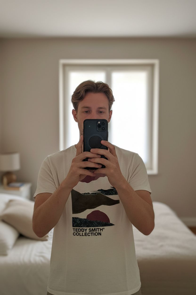 T-shirt Teddy smith L debout, face à la caméra, dans une chambre à la lumière douce, avec une lumière naturelle filtrant par la fenêtre.