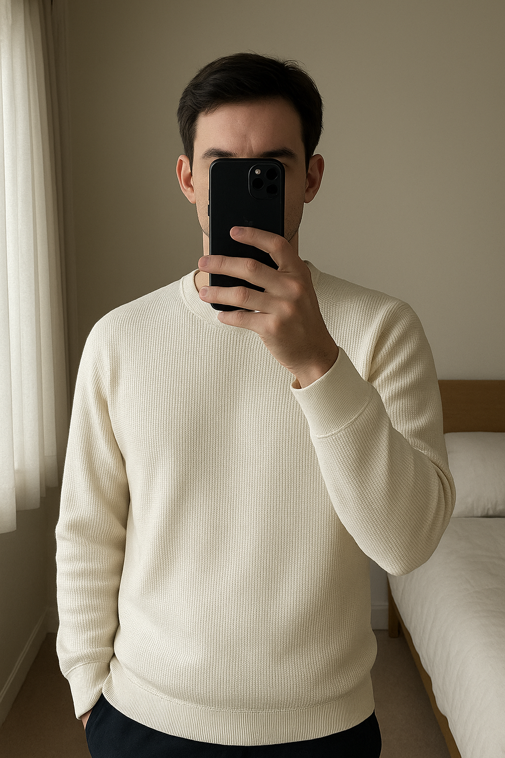 T-shirt thermal waffle debout, face à la caméra, dans une chambre à la lumière douce, avec une lumière naturelle filtrant par la fenêtre.