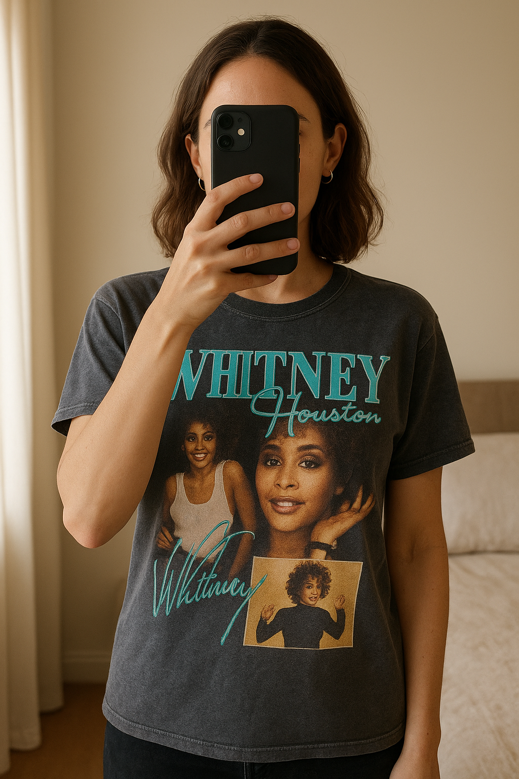 T-shirt Whitney Houston vintage wash – M – gris debout, face à la caméra, dans une chambre à la lumière douce, avec une lumière naturelle filtrant par la fenêtre.