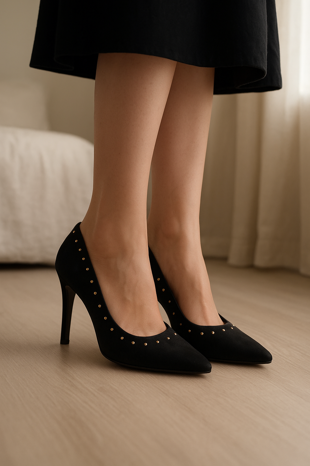 Talons noires avec clous doré Sergio Todzi debout, face à la caméra, dans une chambre à la lumière douce, avec une lumière naturelle filtrant par la fenêtre.