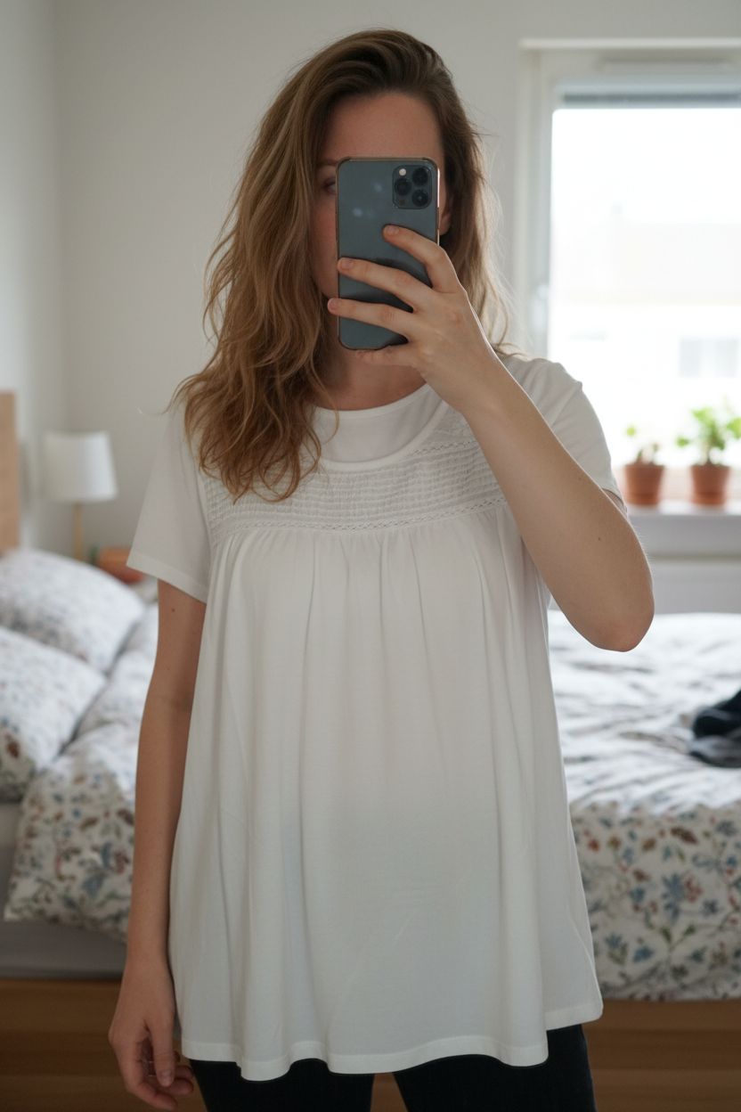 Tee shirt armand thiery taille l debout, face à la caméra, dans une chambre à la lumière douce, avec une lumière naturelle filtrant par la fenêtre.