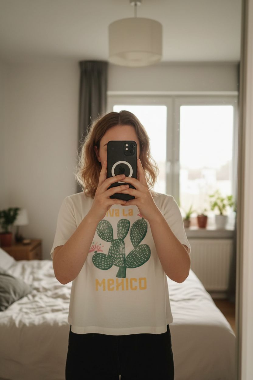 Une personne en Tee shirt blanc cactus debout, face à la caméra, avec une silhouette légèrement plus ronde, dans une chambre à la lumière douce, avec une lumière naturelle filtrant par la fenêtre.