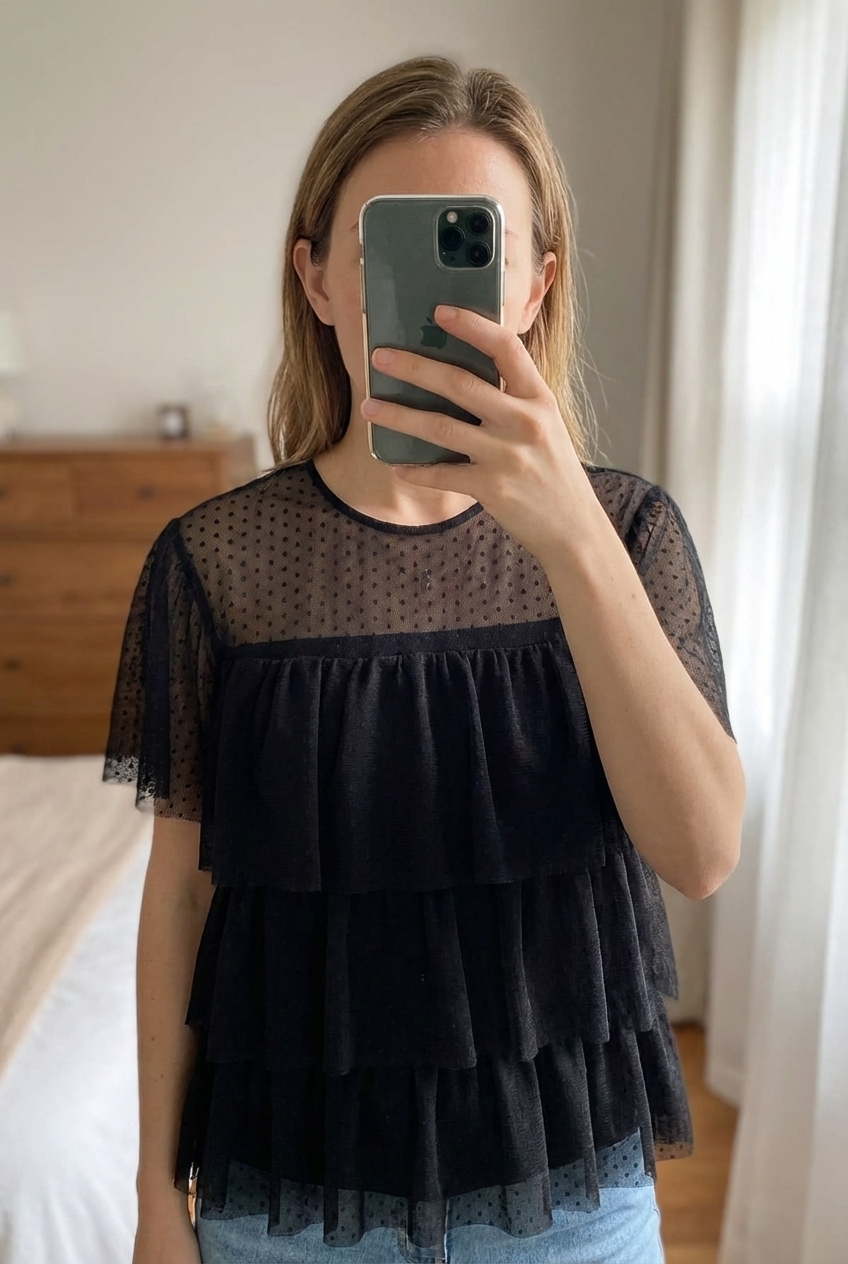 Tee shirt Claudie Pierlot taille 2 debout, face à la caméra, dans une chambre à la lumière douce, avec une lumière naturelle filtrant par la fenêtre.