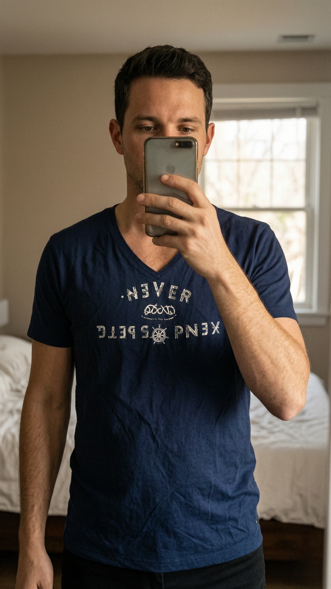 Tee shirt col V bleu - M - Bonobo debout, face à la caméra, dans une chambre à la lumière douce, avec une lumière naturelle filtrant par la fenêtre.