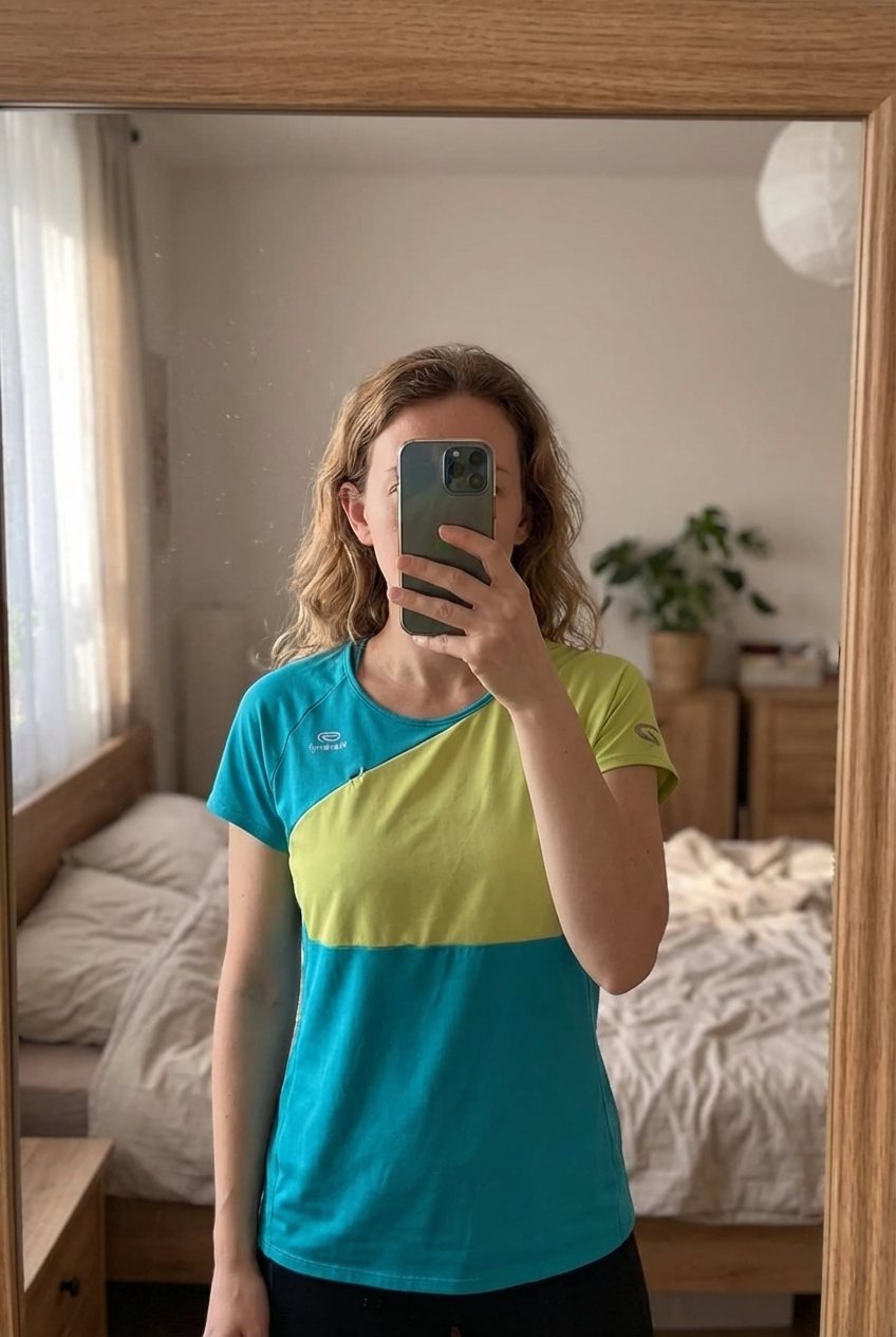 Tee shirt de sport femme décathlon taille 40 debout, face à la caméra, dans une chambre à la lumière douce, avec une lumière naturelle filtrant par la fenêtre.