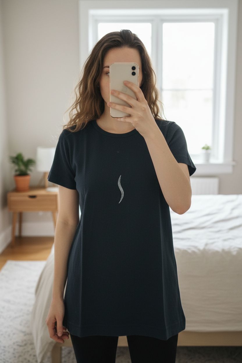 Tee shirt femme noir strass Sephora debout, face à la caméra, dans une chambre à la lumière douce, avec une lumière naturelle filtrant par la fenêtre.
