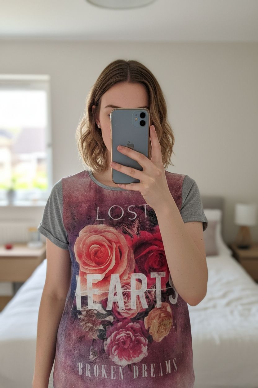 Tee-shirt imprimé floral Promod taille M debout, face à la caméra, dans une chambre à la lumière douce, avec une lumière naturelle filtrant par la fenêtre.