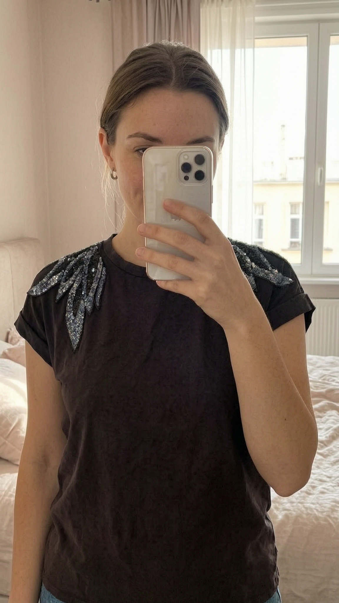 Tee shirt Maje taille 1 debout, face à la caméra, dans une chambre à la lumière douce, avec une lumière naturelle filtrant par la fenêtre.