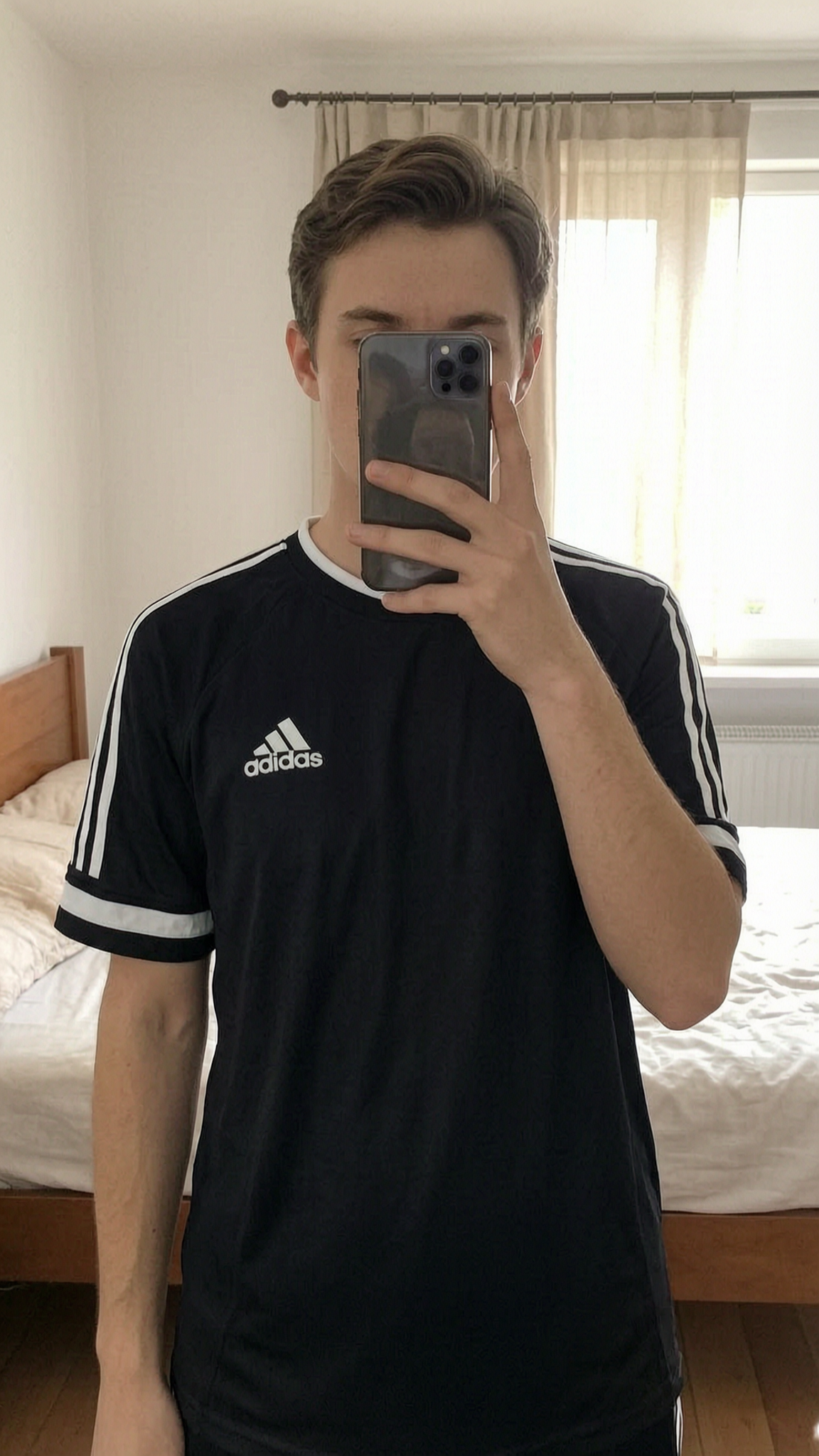 Tee-shirt noir debout, face à la caméra, dans une chambre à la lumière douce, avec une lumière naturelle filtrant par la fenêtre.