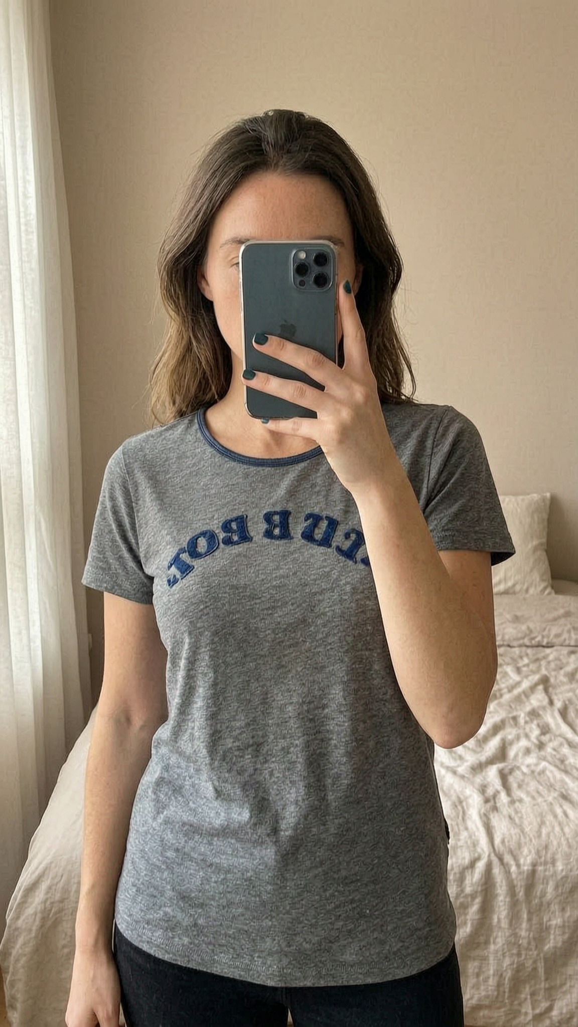 Tee shirt Scotch & Soda taille 2 debout, face à la caméra, dans une chambre à la lumière douce, avec une lumière naturelle filtrant par la fenêtre.