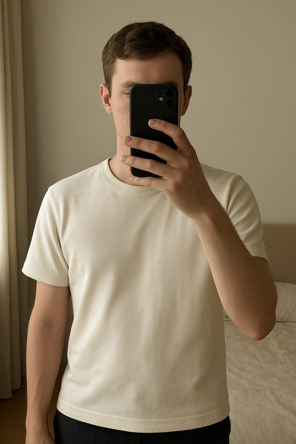 tee-shirts Bershka debout, face à la caméra, dans une chambre à la lumière douce, avec une lumière naturelle filtrant par la fenêtre.