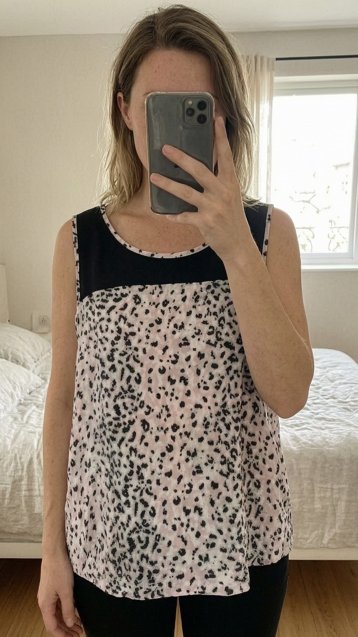 Top blouse légère sans manches Jacqueline de yong t42 TBE debout, face à la caméra, dans une chambre à la lumière douce, avec une lumière naturelle filtrant par la fenêtre.