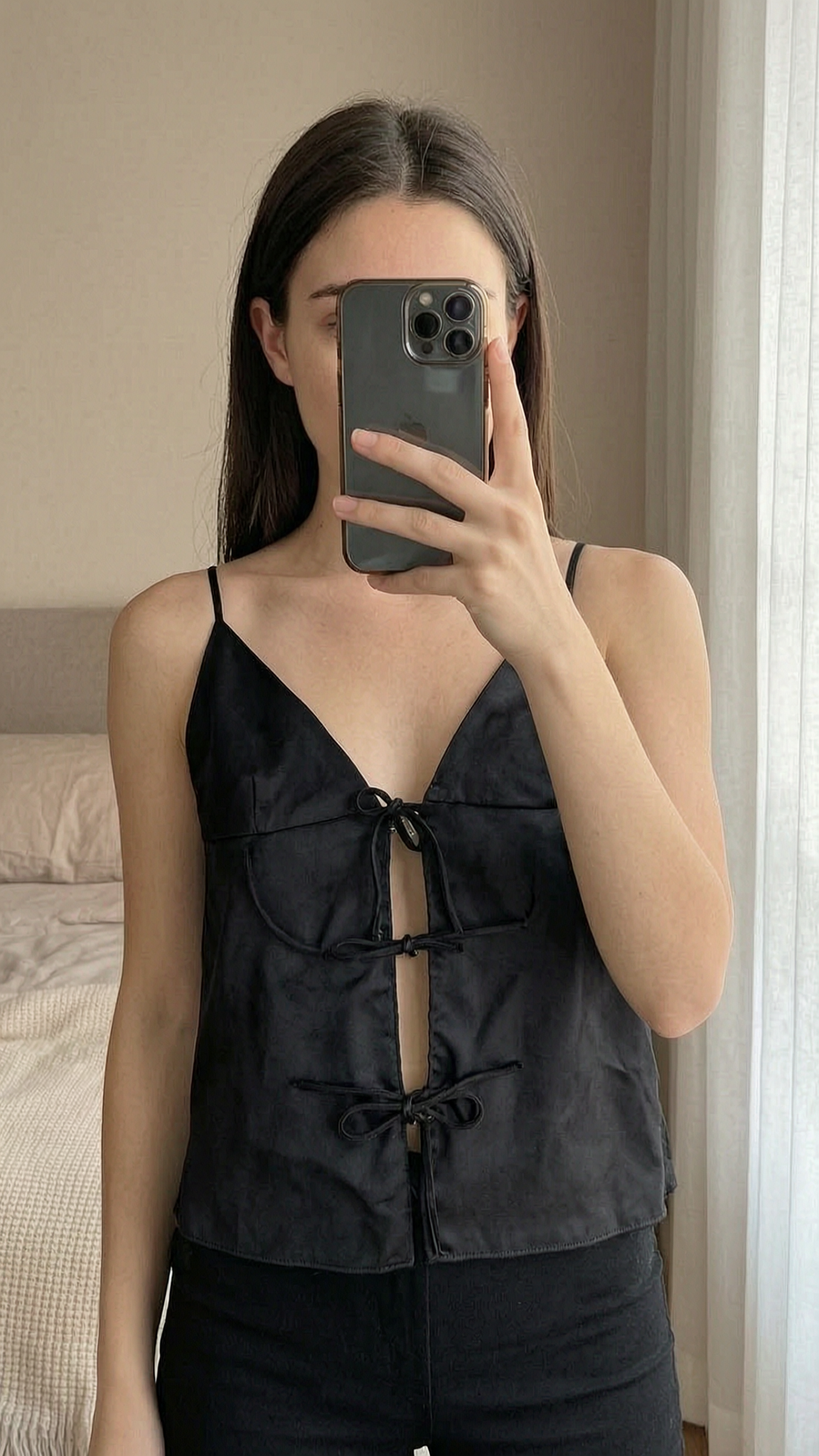 Une personne en Top caraco noir en satin Zara taille M debout, face à la caméra, avec une silhouette fine, dans une chambre à la lumière douce, avec une lumière naturelle filtrant par la fenêtre.