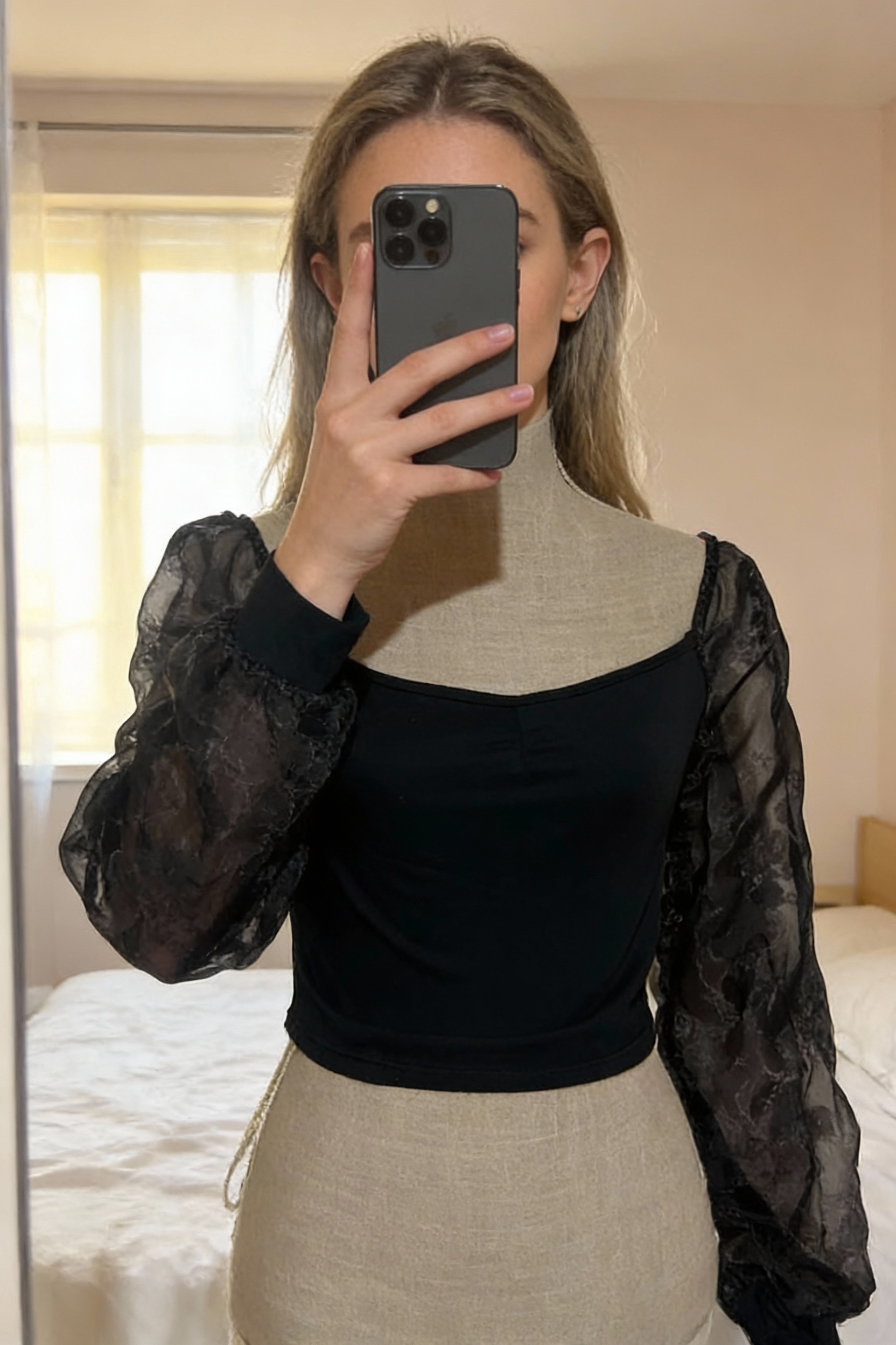 Top court shein L debout, face à la caméra, dans une chambre à la lumière douce, avec une lumière naturelle filtrant par la fenêtre.