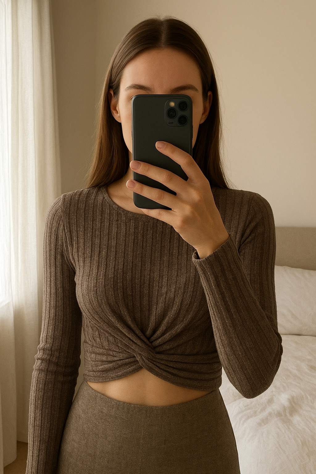 Top court shein taille L debout, face à la caméra, dans une chambre à la lumière douce, avec une lumière naturelle filtrant par la fenêtre.