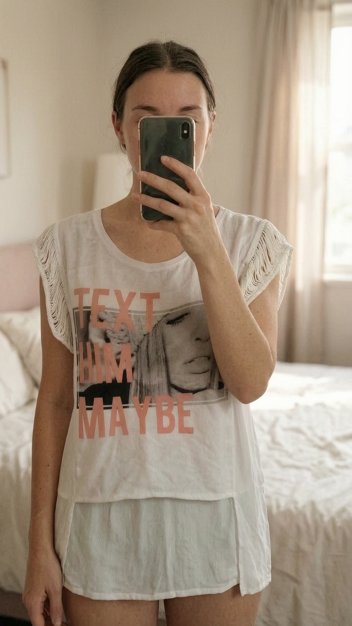 Top débardeur Bershka asymétrique oversize taille s/m debout, face à la caméra, dans une chambre à la lumière douce, avec une lumière naturelle filtrant par la fenêtre.