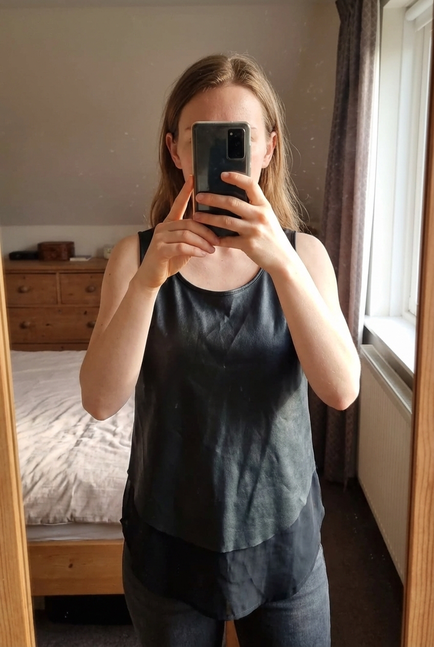Top debardeur simili cuir noir debout, face à la caméra, dans une chambre à la lumière douce, avec une lumière naturelle filtrant par la fenêtre.