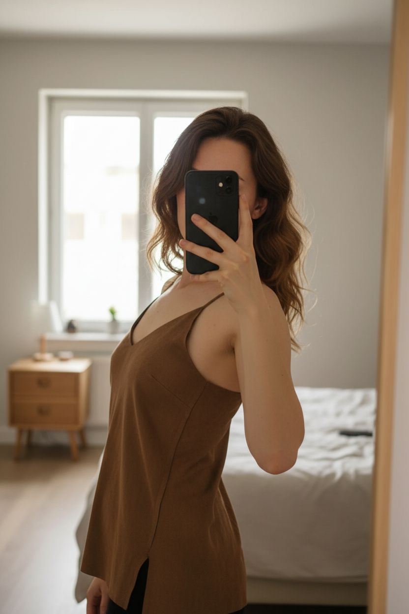 Une personne en Top en suédine marron Golden Days - Encolure V dos et devant cambrant légèrement le dos pour une pose dynamique, dans une chambre à la lumière douce, avec une lumière naturelle filtrant par la fenêtre.
