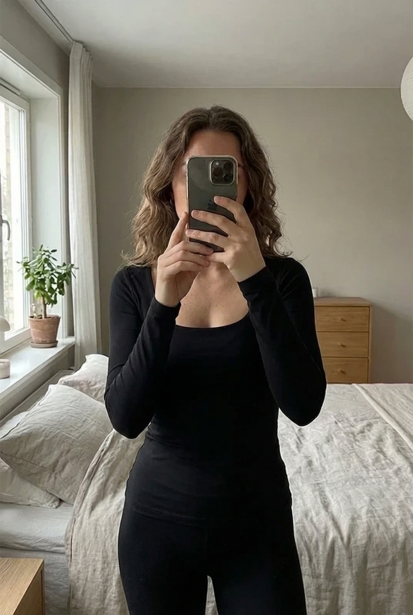 Top manche longue moulant debout, face à la caméra, dans une chambre à la lumière douce, avec une lumière naturelle filtrant par la fenêtre.