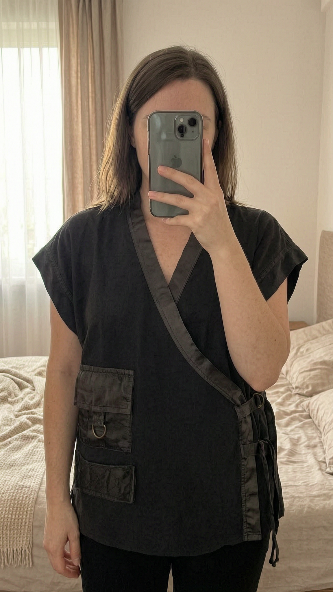 Top noir court T38 coton sans manches . debout, face à la caméra, dans une chambre à la lumière douce, avec une lumière naturelle filtrant par la fenêtre.