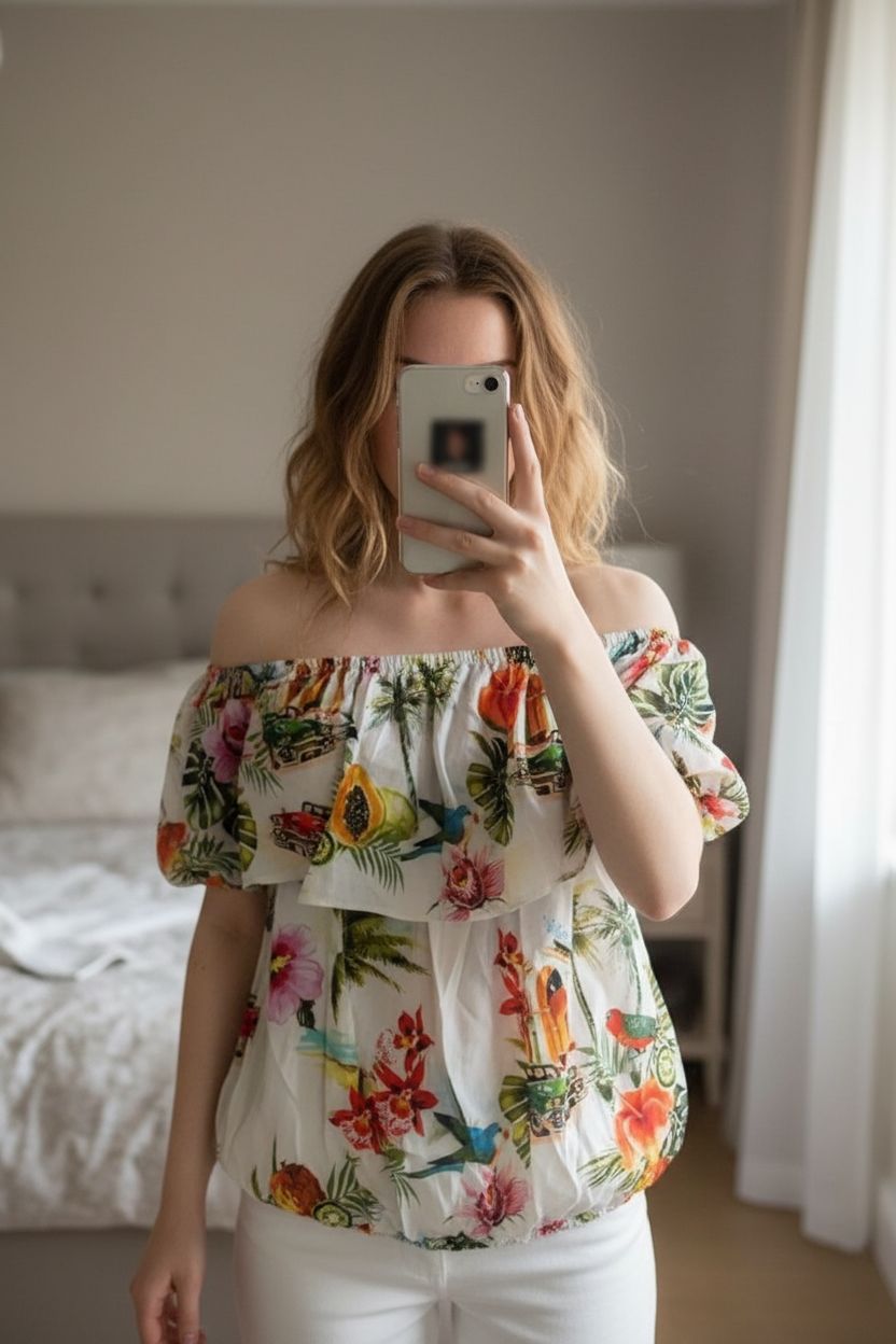 Top épaule nue naf naf taille 38 debout, face à la caméra, dans une chambre à la lumière douce, avec une lumière naturelle filtrant par la fenêtre.