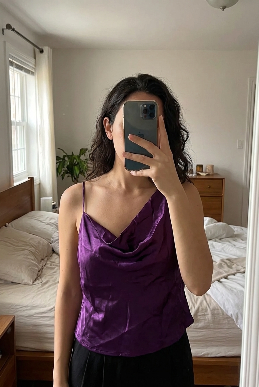 Top satin violet Zara taille M neuf avec étiquette debout, face à la caméra, dans une chambre à la lumière douce, avec une lumière naturelle filtrant par la fenêtre.
