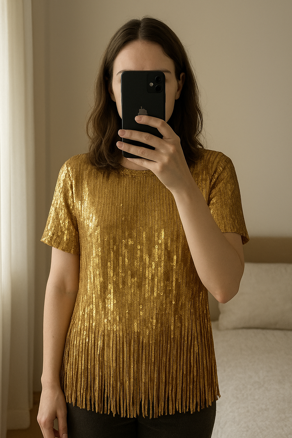 Top sequins dorés debout, face à la caméra, dans une chambre à la lumière douce, avec une lumière naturelle filtrant par la fenêtre.