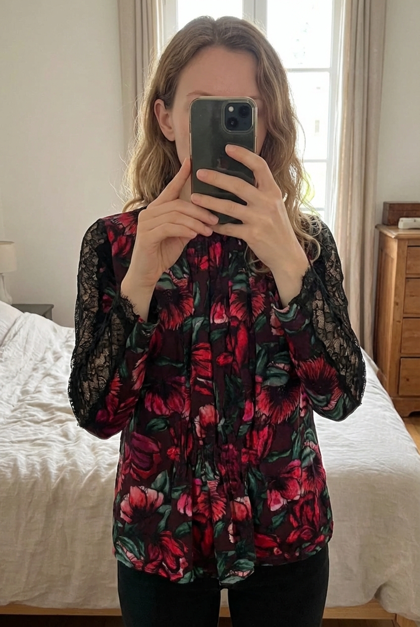 Une personne en Top soie Sandro T 36 debout, face à la caméra, avec une silhouette fine, dans une chambre à la lumière douce, avec une lumière naturelle filtrant par la fenêtre.