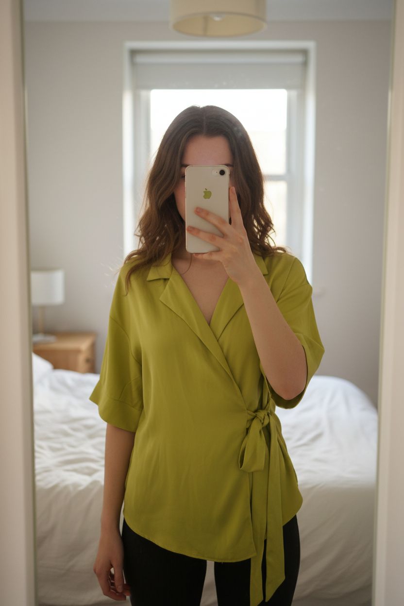 Topshop Lime Green Wrap Blouse Size UK 8 (EU 36) New Without Tags standing straight facing the camera, in a softly lit bedroom setting, with gentle natural light filtering through a window.
