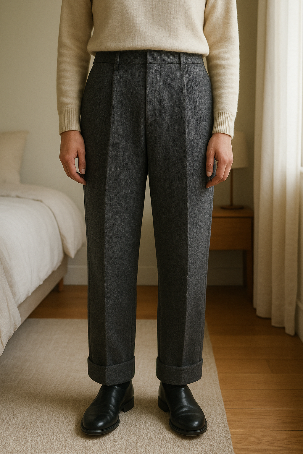 Très joli pantalon mode debout, face à la caméra, dans une chambre à la lumière douce, avec une lumière naturelle filtrant par la fenêtre.