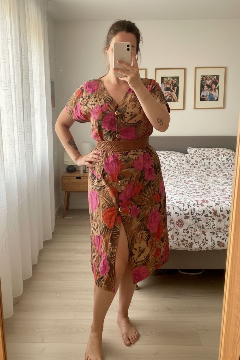 Une personne en Très jolie robe vintage des années 80 cambrant légèrement le dos pour une pose dynamique, dans une chambre à la lumière douce, avec une lumière naturelle filtrant par la fenêtre.