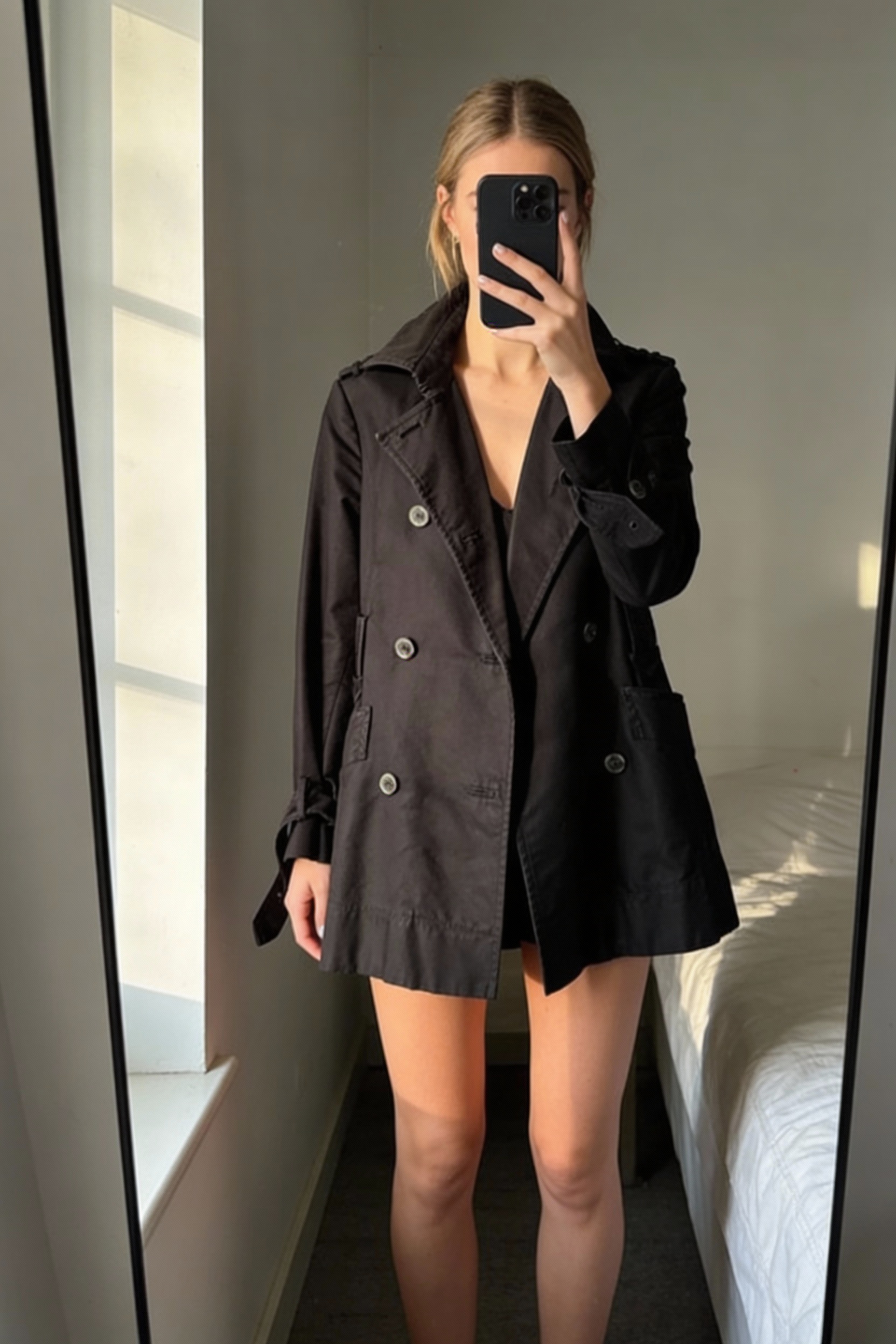 trench noir H&M femme debout, face à la caméra, dans une chambre à la lumière douce, avec une lumière naturelle filtrant par la fenêtre.