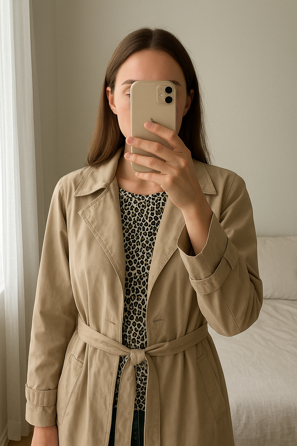 Trench Zara taille S debout, face à la caméra, dans une chambre à la lumière douce, avec une lumière naturelle filtrant par la fenêtre.