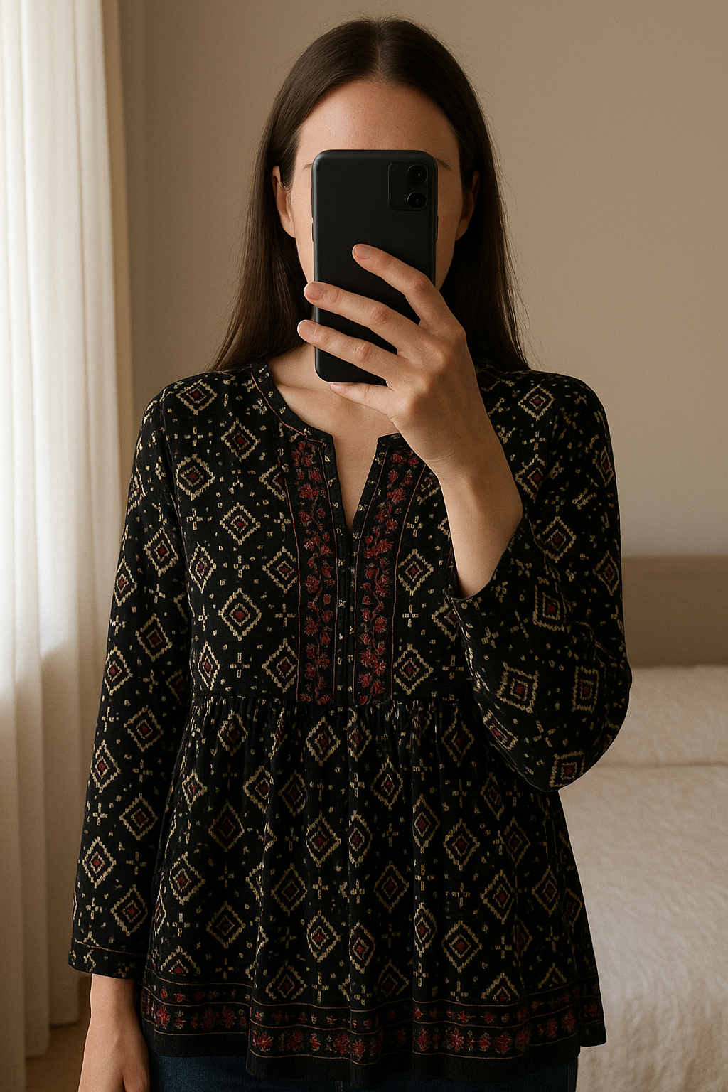 Tunique Haut femmes debout, face à la caméra, dans une chambre à la lumière douce, avec une lumière naturelle filtrant par la fenêtre.