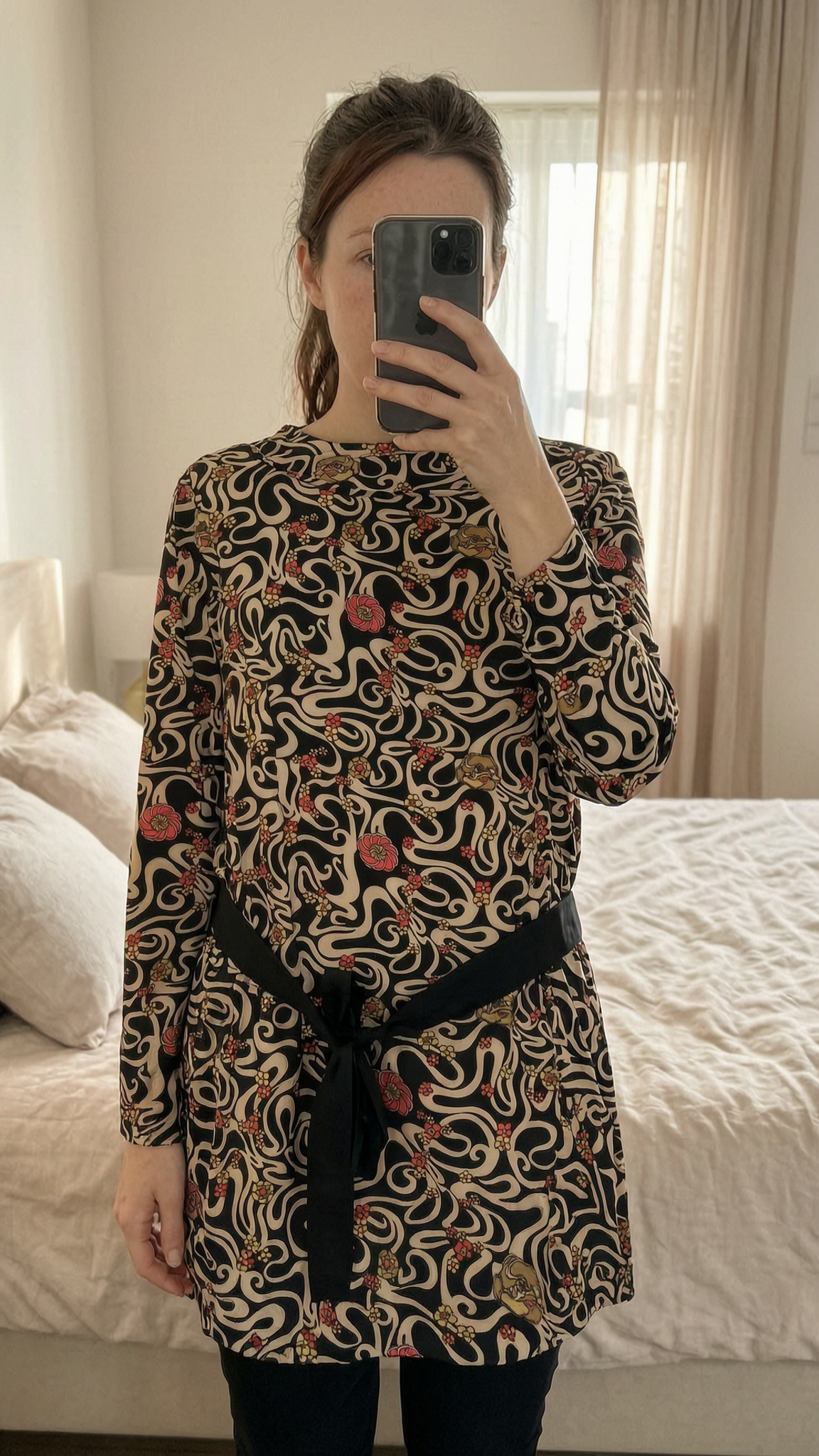 Tunique légère DDP taille L noeud à la taille debout, face à la caméra, dans une chambre à la lumière douce, avec une lumière naturelle filtrant par la fenêtre.