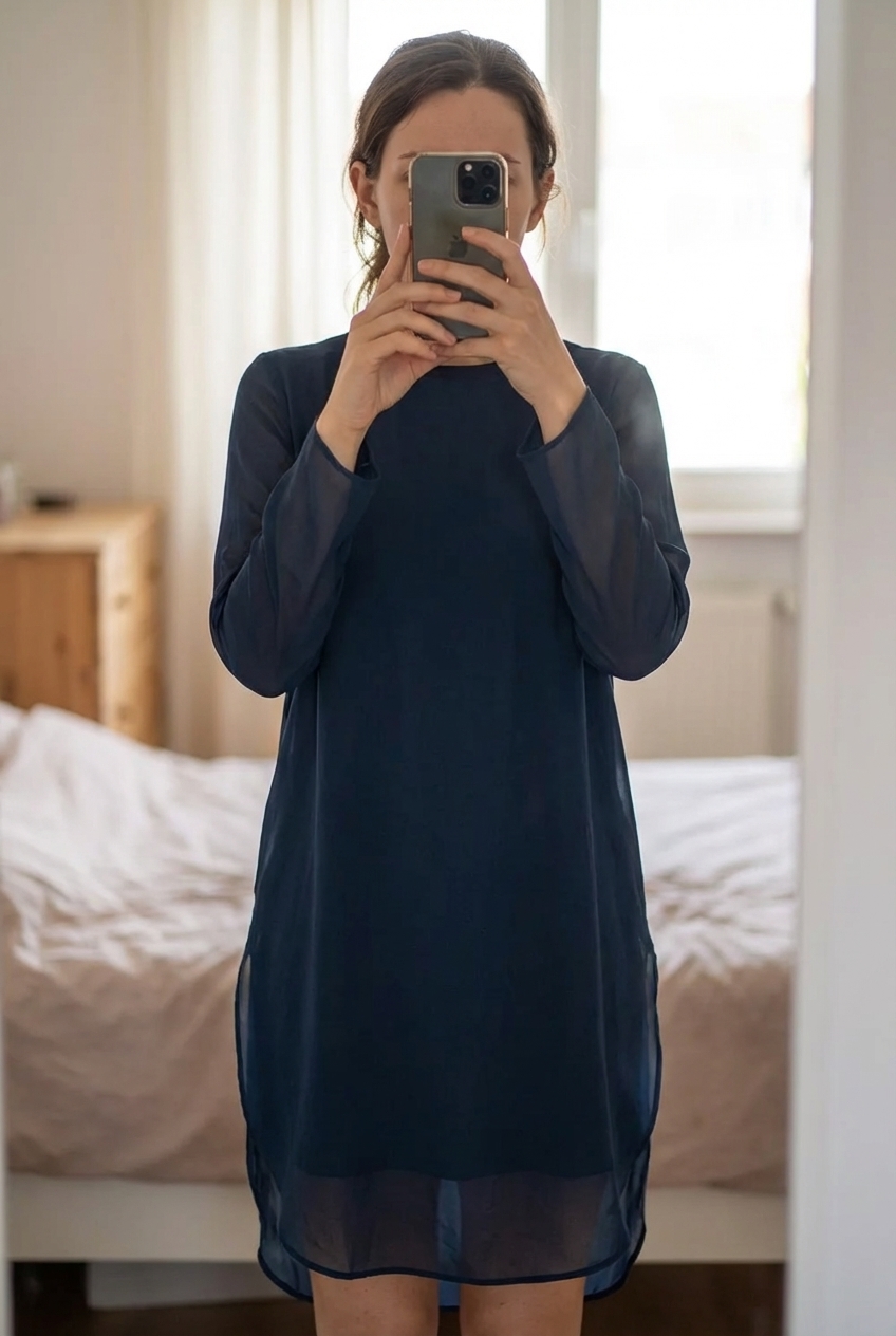 Tunique Zara bleu fluide manches longues debout, face à la caméra, dans une chambre à la lumière douce, avec une lumière naturelle filtrant par la fenêtre.