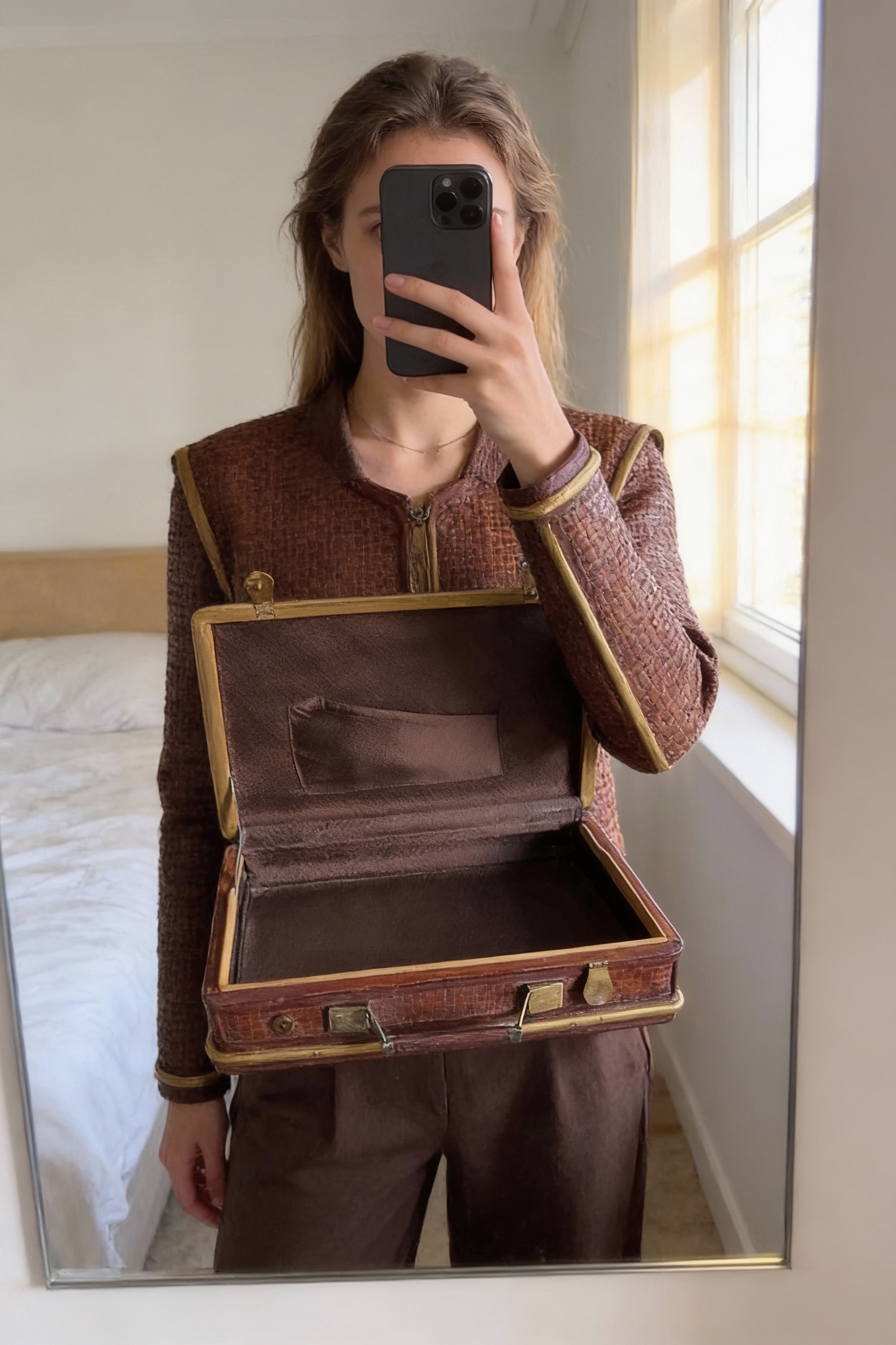 Valise vintage style affaire en rotin et tissu debout, face à la caméra, dans une chambre à la lumière douce, avec une lumière naturelle filtrant par la fenêtre.