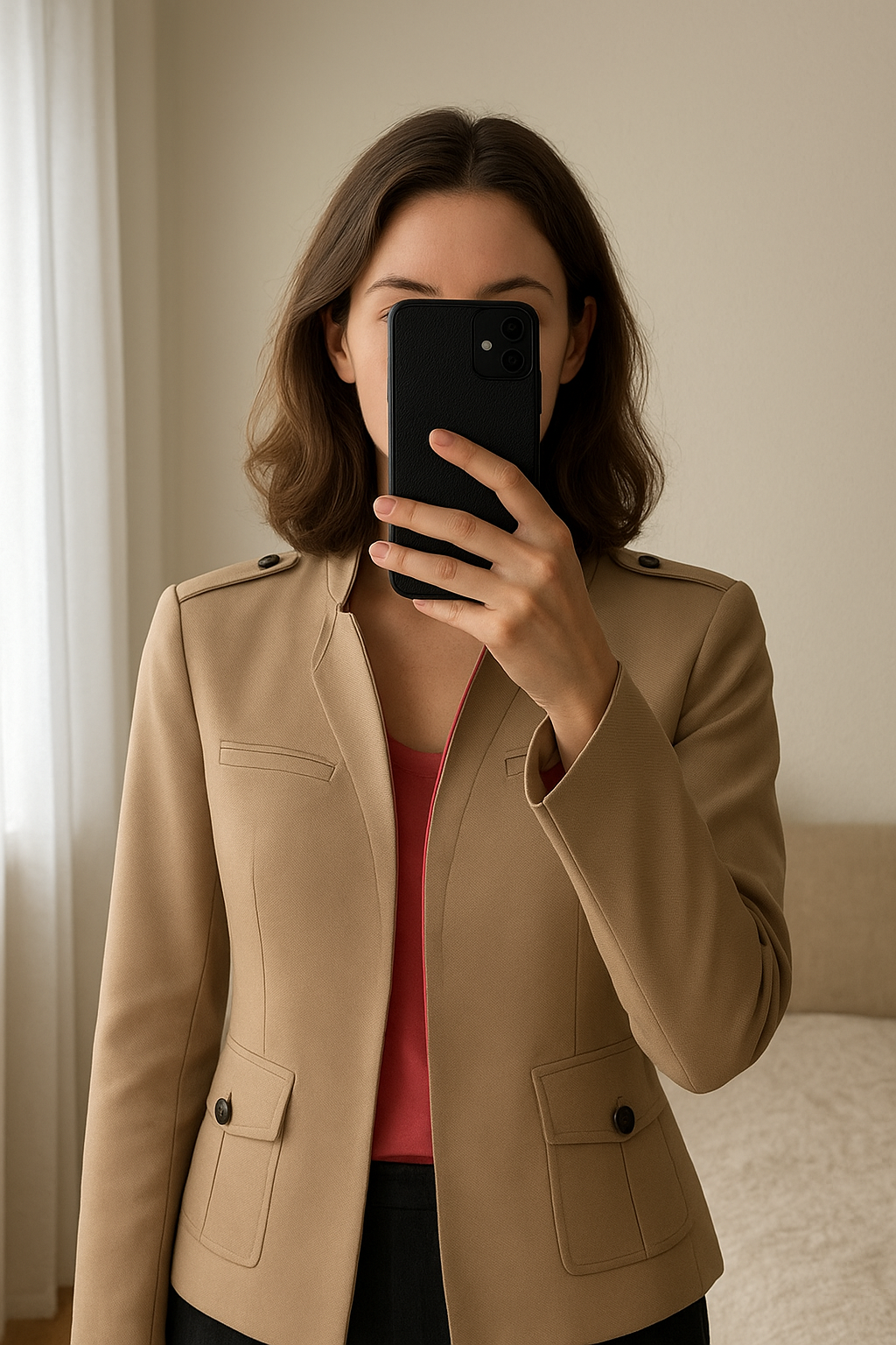 Veste debout, face à la caméra, dans une chambre à la lumière douce, avec une lumière naturelle filtrant par la fenêtre.