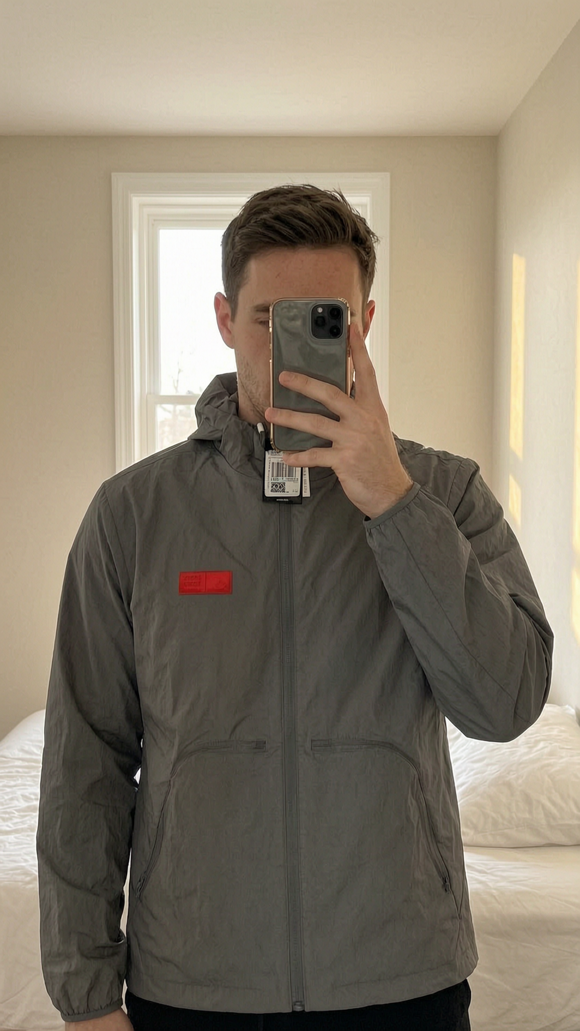 Veste adidas collaboration Audi debout, face à la caméra, dans une chambre à la lumière douce, avec une lumière naturelle filtrant par la fenêtre.