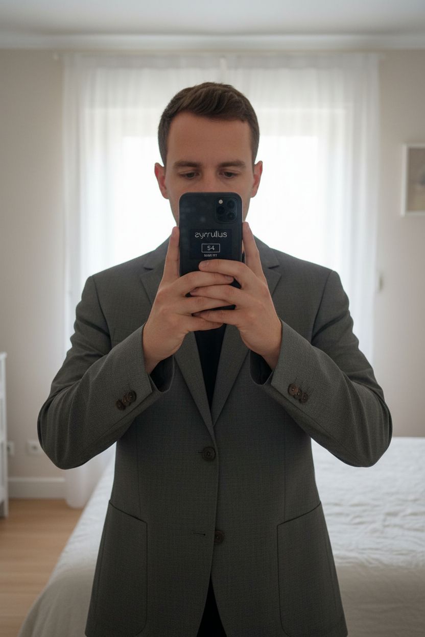 Veste Blazer gris petits carreaux Cyrillus 54 slim fit debout, face à la caméra, dans une chambre à la lumière douce, avec une lumière naturelle filtrant par la fenêtre.