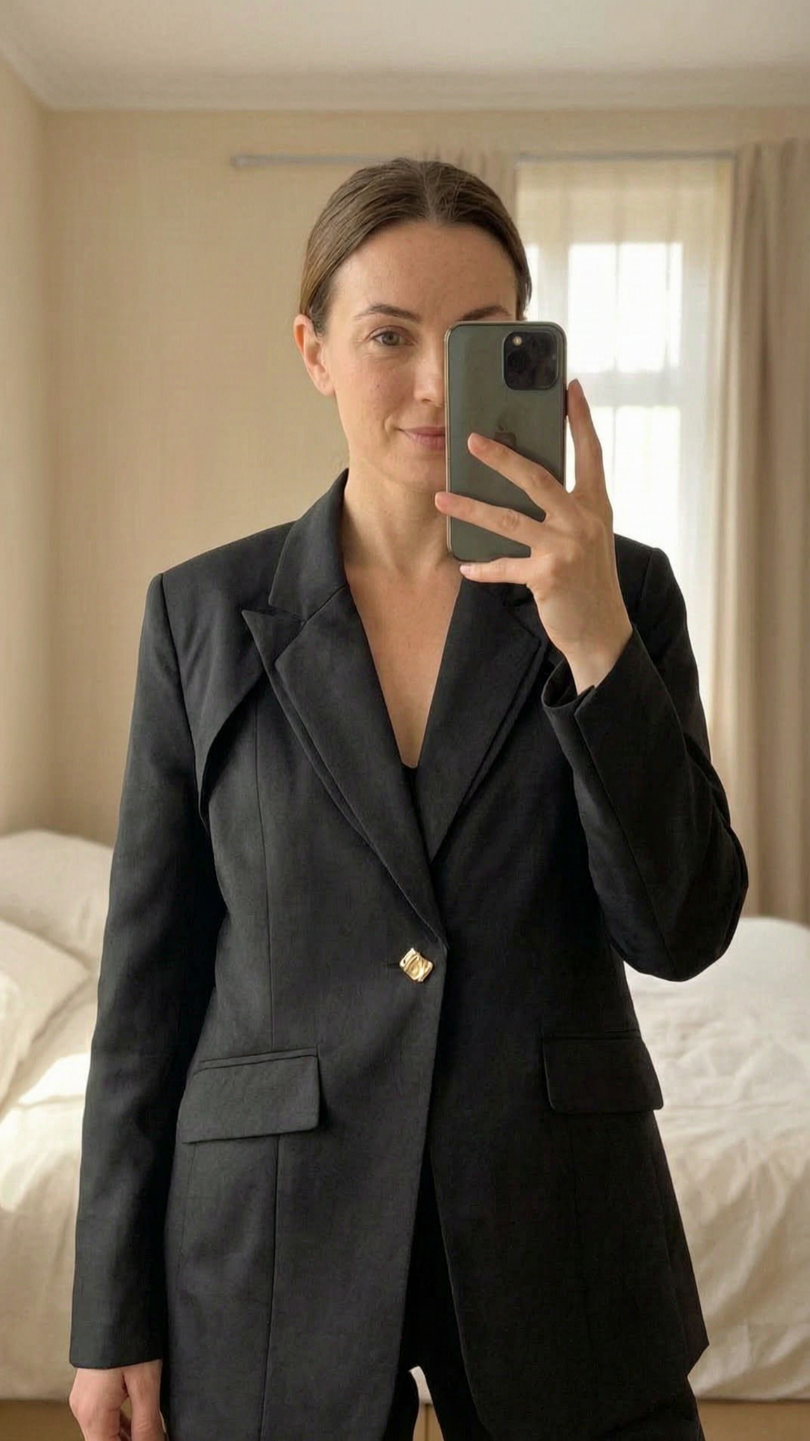 Veste Blazer noire habillée 1 bouton Anewsta debout, face à la caméra, dans une chambre à la lumière douce, avec une lumière naturelle filtrant par la fenêtre.