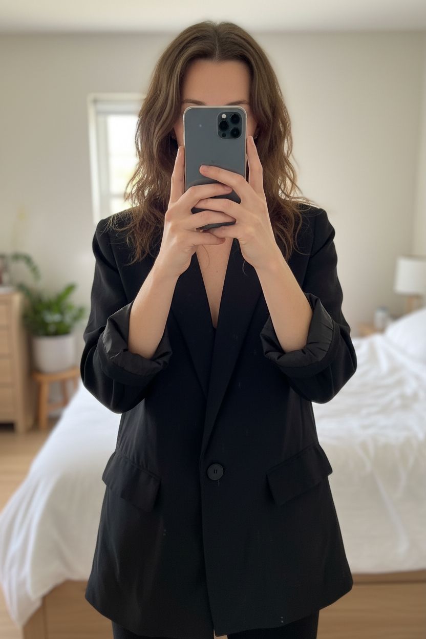 Veste Blazer noire manches 3/4 MANGO debout, face à la caméra, dans une chambre à la lumière douce, avec une lumière naturelle filtrant par la fenêtre.