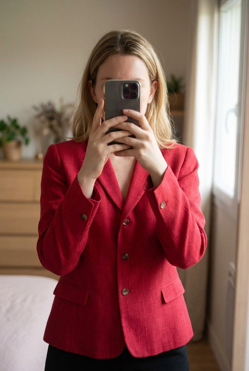 Une personne en Veste / blazer vintage debout, face à la caméra, dans une chambre à la lumière douce, avec une lumière naturelle filtrant par la fenêtre.