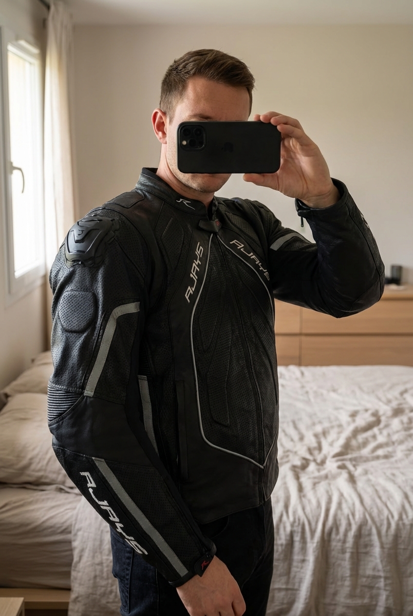 Veste Blouson de moto en cuir véritable Vintage Leather jacket Noir Rjays XL/XXL debout, face à la caméra, dans une chambre à la lumière douce, avec une lumière naturelle filtrant par la fenêtre.