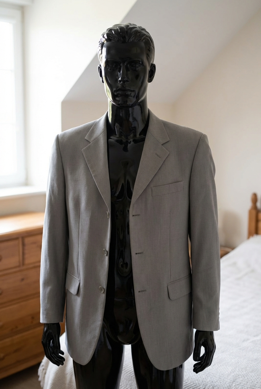 un mannequin noir brillant en plastique, sans traits du visage en Veste Burton homme 48 debout, face à la caméra, dans une chambre à la lumière douce, avec une lumière naturelle filtrant par la fenêtre.