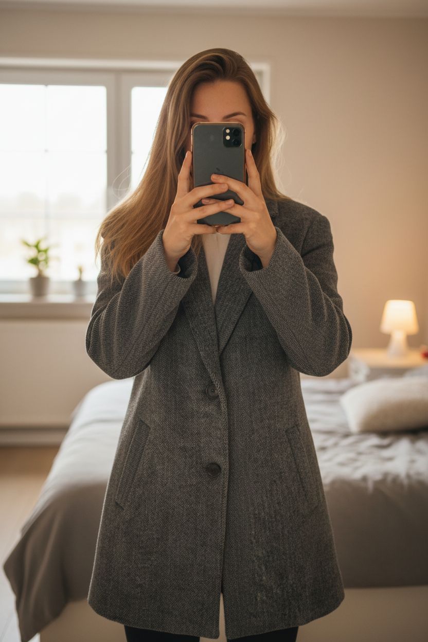 Veste cabans grise femme debout, face à la caméra, dans une chambre à la lumière douce, avec une lumière naturelle filtrant par la fenêtre.