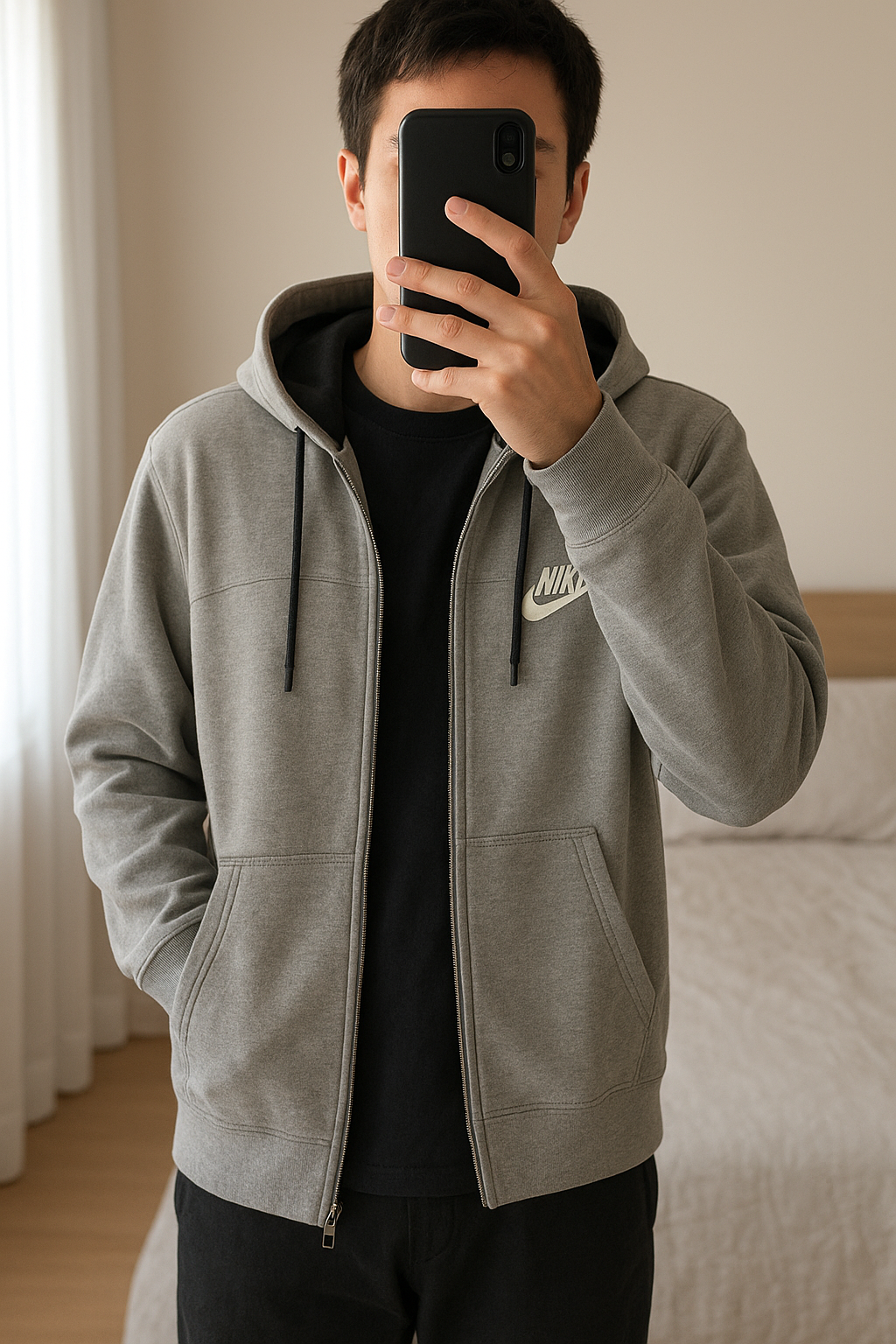 Veste à capuche zip sport Nike Homme Grise et noir Taille L debout, face à la caméra, dans une chambre à la lumière douce, avec une lumière naturelle filtrant par la fenêtre.