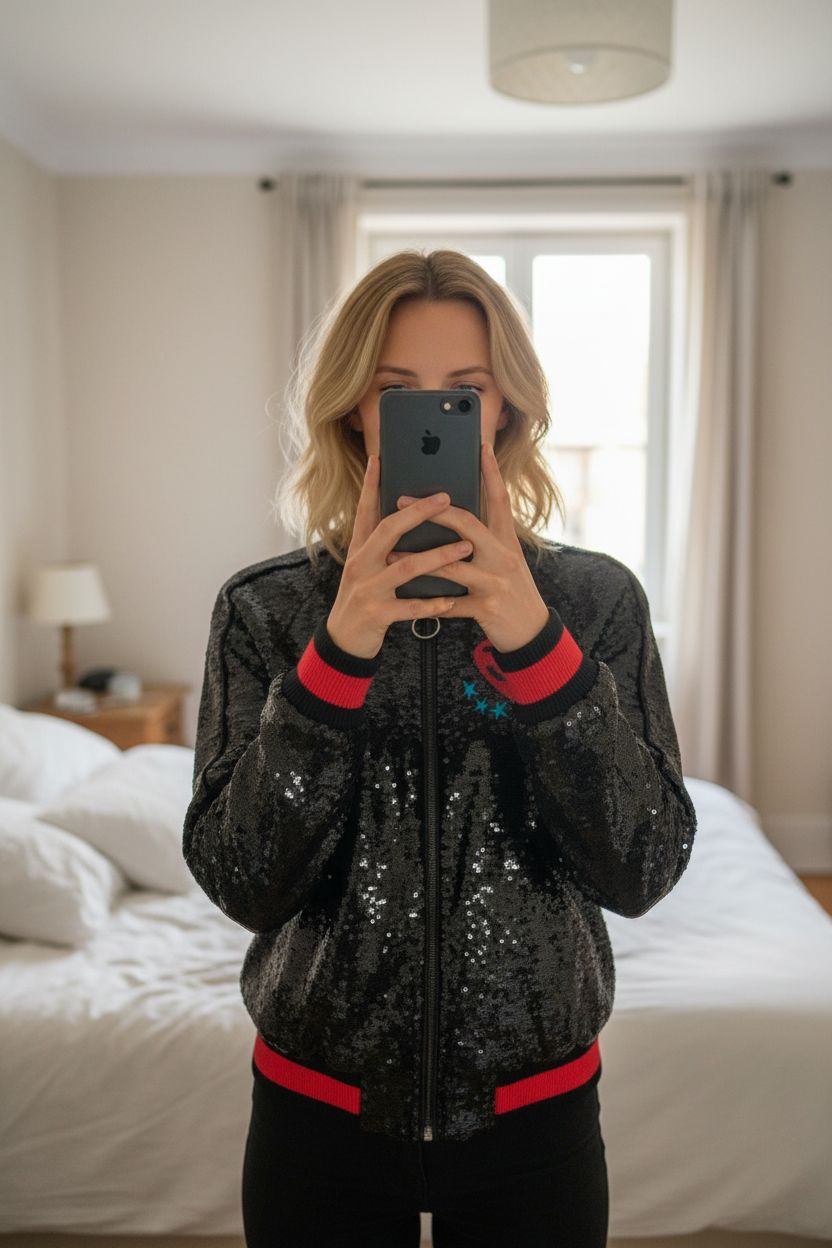 Une personne en Veste coupe teddy sequins Maje T36 neuf debout, face à la caméra, avec une silhouette fine, dans une chambre à la lumière douce, avec une lumière naturelle filtrant par la fenêtre.